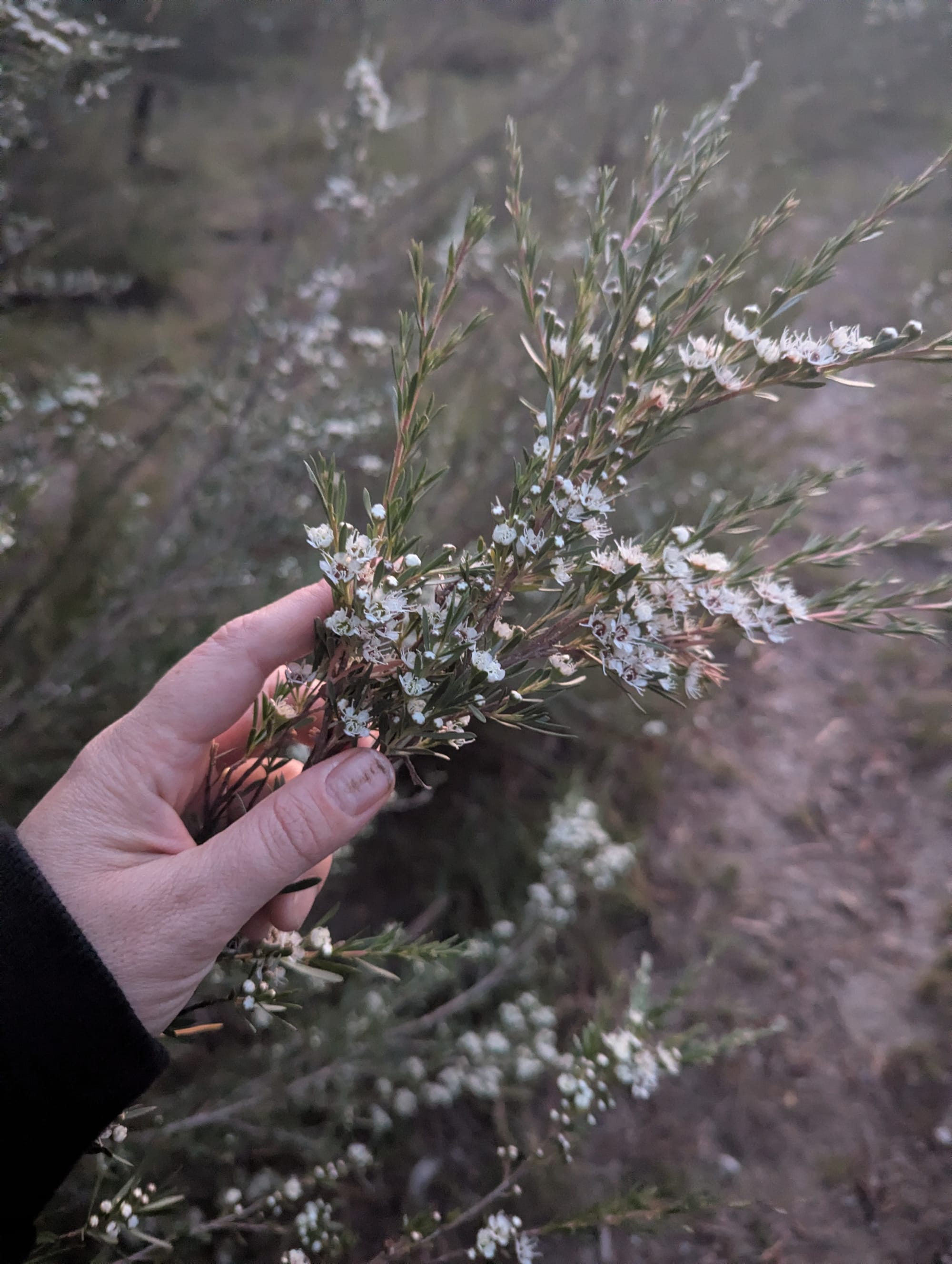 Scents, again I am harvesting scents. In the lead up to Christmas, we had a strange and luscious monsoonal week, and I was once again ensconced in my geosmin, my petrichor. But this was a blend, a perfume. Mixed with kunzea, the soil smells were floral, tonic. There is a forest of kunzea that rims the largest walking track on the property. It does not flower every year, but when it does: honey, menthol, pinene, eucalyptol, limonene. You wait until it rains, you wait until the rain is ceasing: just small drops. You walk downhill, and in rolling waves you smell: rich thick honey, clear grass and rain, sharpness.
