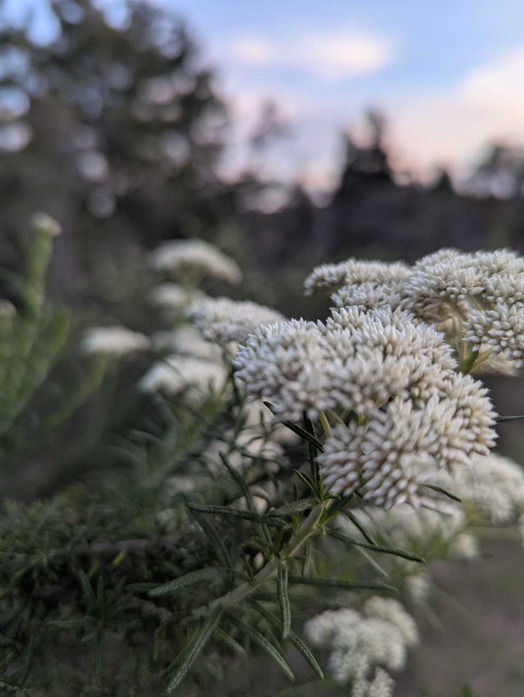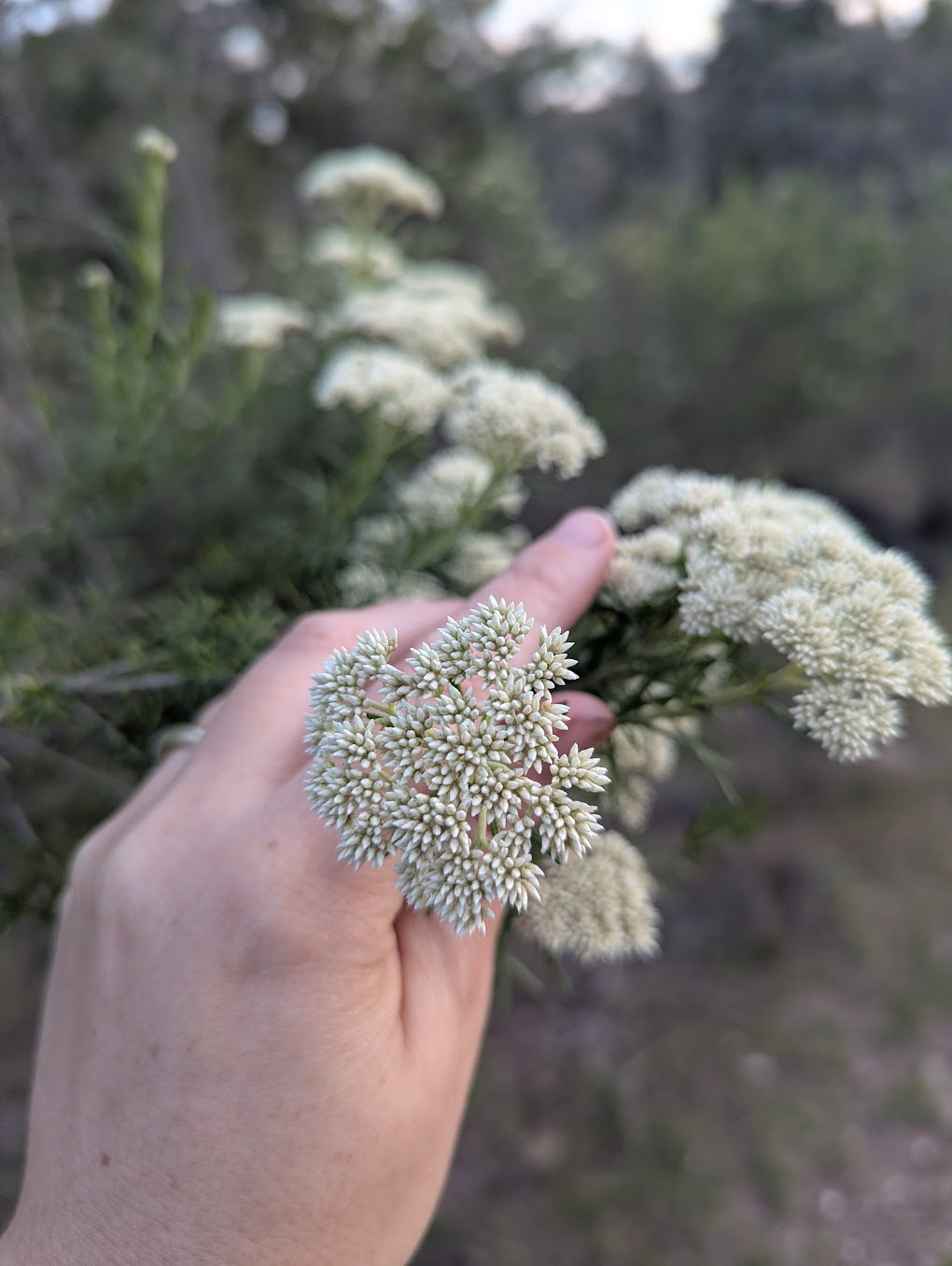 Cassinias are dense here, because, like many of the common native plants that we now get in Wamboin, they are adept at stablising skeletal and damaged soils. They come in as helpers, holding everything together. There is a public path I walk most days, up a steep hill behind the house. As I walk it, I absentmindedly pull off leaves from cassinia quinquefaria and cassinia longifolia, crushing them, and feeling their strong oil on my fingers. Their scents are almost shockingly variable, some stink of curry, while others have that unmistakable limonene smell. Sometimes I cook with them: throwing them into trays of roasting vegetables, or once with Tamuz, making them the herbal centre of a homemade chilli oil. Other times, I dry them, and use them like I’d use sage: the smell is stronger, but harder to light. Often, I just place them in my clothes: a grounding scent to have as I move around the human world. Cassinia are a joy to live alongside.